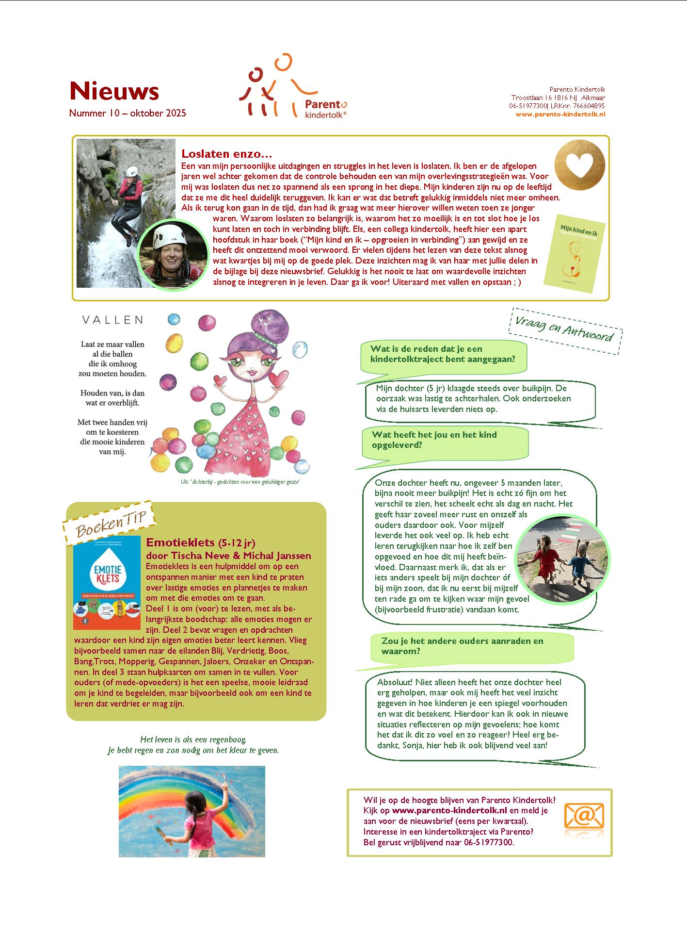 oktober 15, 2025 Nieuwsbrief oktober 2025 Info Loslaten Blije kinderen jaar ervaring met kinderen Blije ouders jaar blij met kindertolken Heb je vragen?Bel gerust vrijblijvend naar: tel: +31 (0)6 51 97 73 00 e-mail: info@parento-kindertolk.nl Bel vrijblijvend